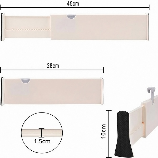 Bilo da se radi o kuhinjskim priborom, toaletnim potrepštinama u kupatilu ili čarapama u spavaćoj sobi – ovi pregradnici se podešavaju od 28 cm do 45 cm kako bi odgovarali većini fioka. Možete prilagoditi svoj prostor tačno onako kako vam odgovara.